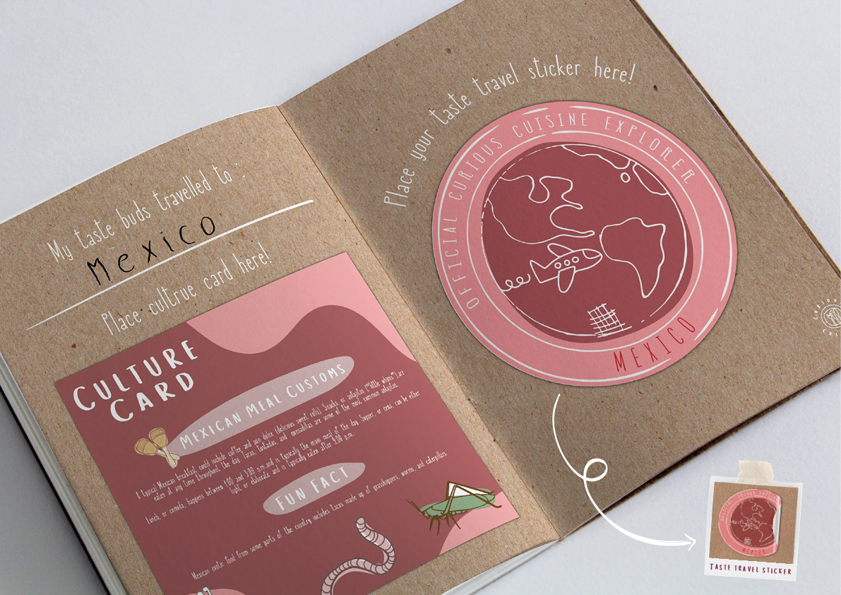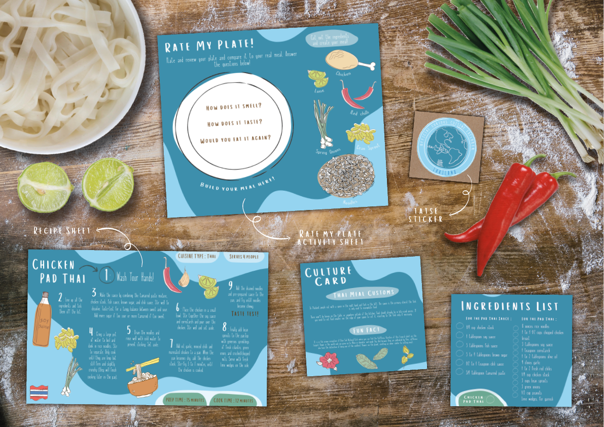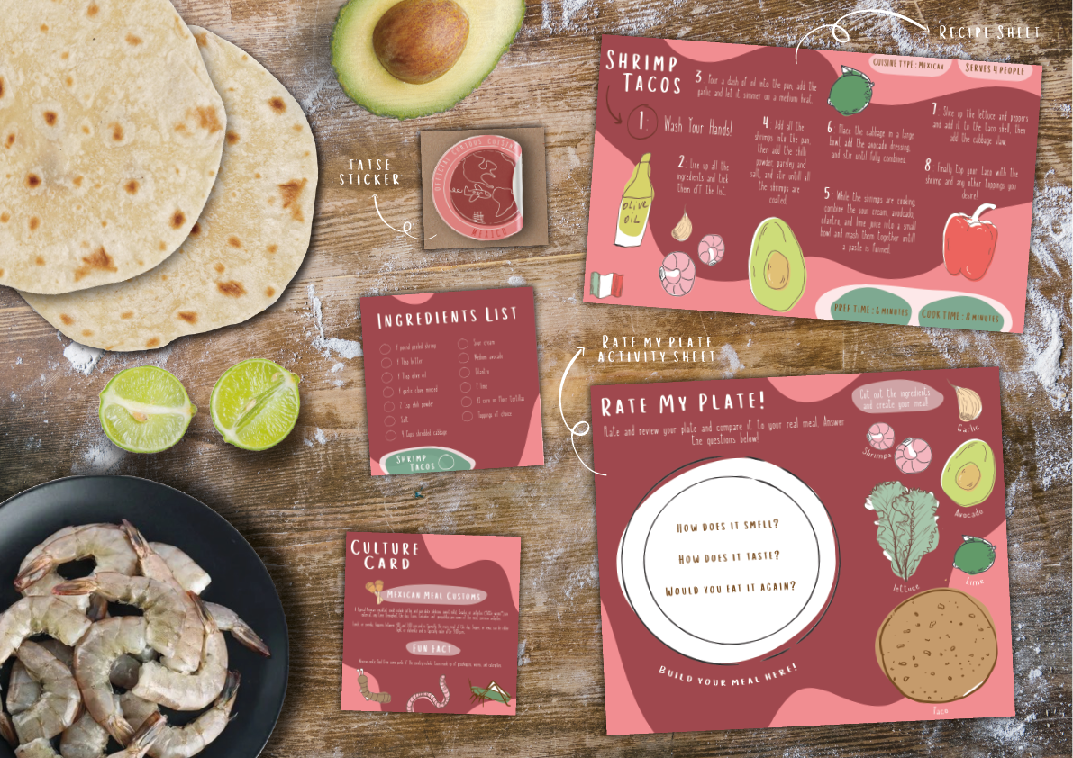 Each order comes with a “Food Passport” that allows families to document and track the different cuisines they've tried, encouraging culinary exploration and adventure. I also designed “Culture Cards” which include information and fun facts about the origin and culture that the meal is derived from. Additionally, I designed worksheets where kids can cut out and arrange ingredients, helping them understand meal preparation in a hands-on way.