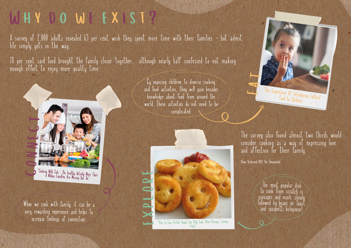 I created Curious Cuisines to bring families closer together through the joy of cooking and exploring new cuisines. Recognising that mealtime is often a rushed, chaotic experience for busy families, I wanted to design a service that makes good food more accessible, and turns the act of cooking into an engaging, educational, and fun experience.